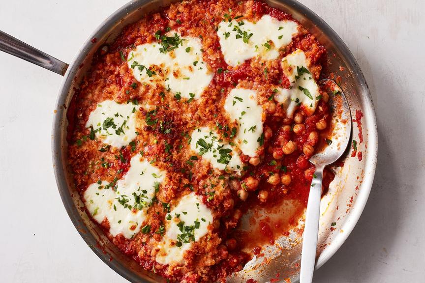 Enjoy a comforting twist on a classic with Skillet Chickpea Parmesan, featuring chickpeas simmered in garlicky tomato sauce, topped with mozzarella and Parmesan bread crumbs, and broiled to golden perfection.