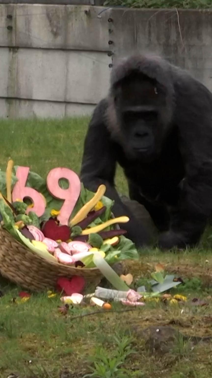 Fatou, the world's oldest known gorilla, celebrates her 69th birthday with a vegetable basket