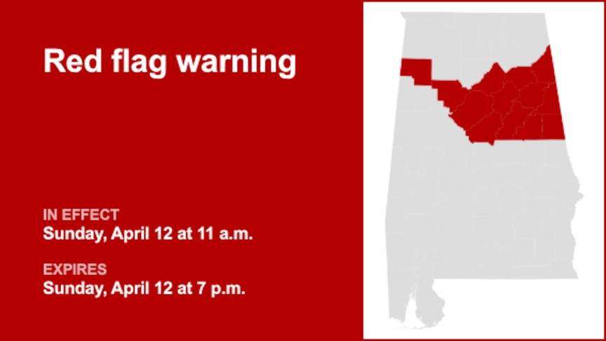 On Saturday at 10:01 p.m. a red flag warning was issued by the National Weather Service valid for Sunday between 11 a.m. and 7 p.m. for Marion, Walker, Blount, Etowah, Calhoun, Cherokee, Cleburne, Jefferson, Shelby, St. Clair, Talladega, Clay and Randolph counties.