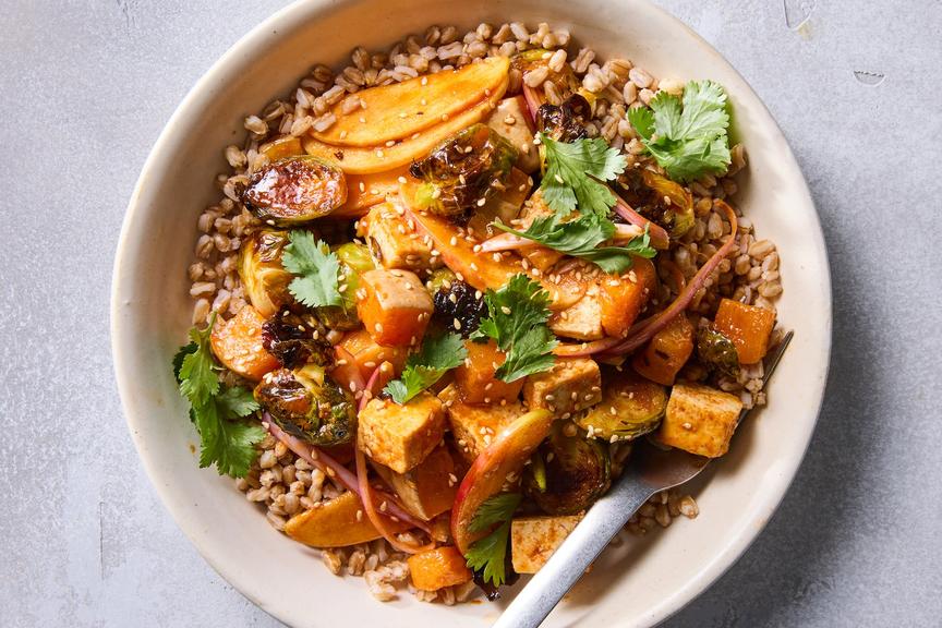 This vibrant sheet-pan dish combines roasted tofu, squash, and brussels sprouts in a spicy gochujang-apple cider vinaigrette, served atop nutty whole grains with crisp apple and shallot for added freshness.