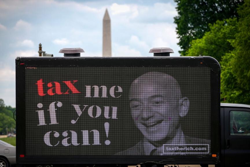 The group known as Patriotic Millionaires staged a protest outside Jeff Bezos' house on Wednesday
