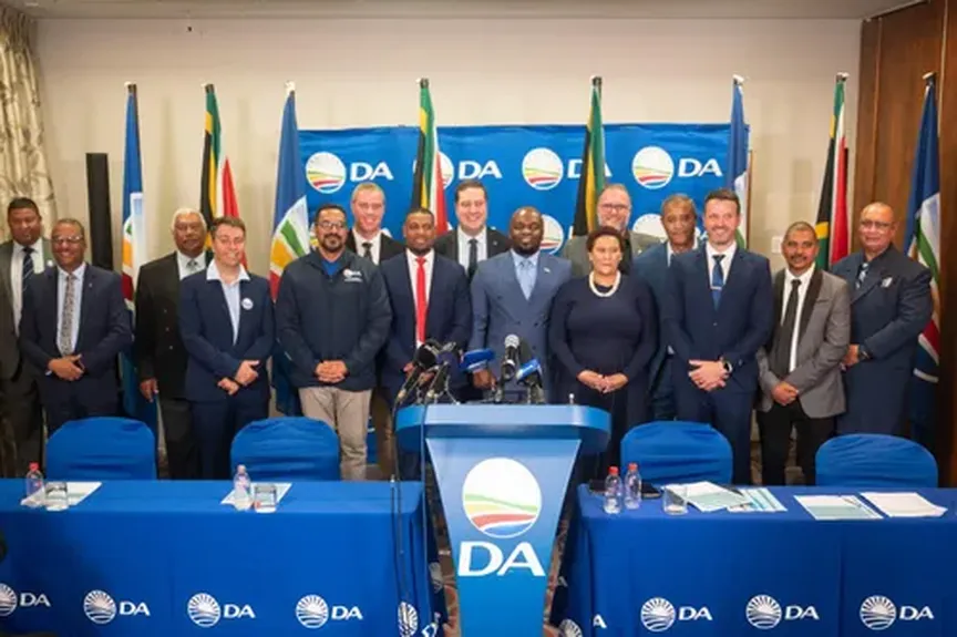 The newly announced mayoral candidates and DA leadership at a press briefing, as the party ramps up its campaign ahead of the 2026 local government elections.