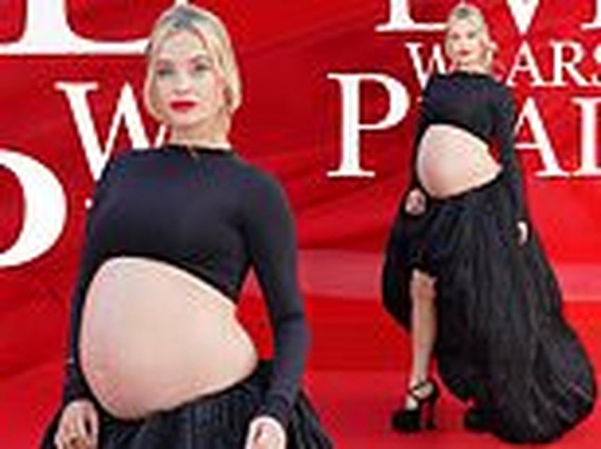 Pregnant Laura Whitmore showed off her bare baby bump in a black crop top and skirt as she attended the Devil Wears Prada 2 premiere in London on Wednesday.