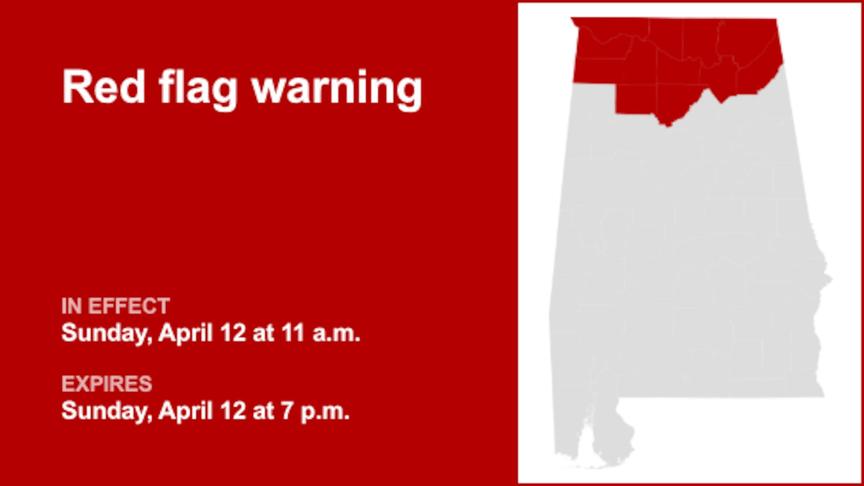 On Saturday at 9:45 p.m. the National Weather Service issued a red flag warning valid for Sunday between 11 a.m. and 7 p.m. for Lauderdale, Colbert, Franklin, Lawrence, Limestone, Madison, Morgan, Marshall, Jackson, DeKalb, Winston and Cullman counties.