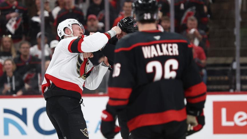 Jordan Staal and Brady Tkachuk started the Stanley Cup playoffs with a bang, dropping the gloves off the opening faceoff of Hurricanes-Senators.