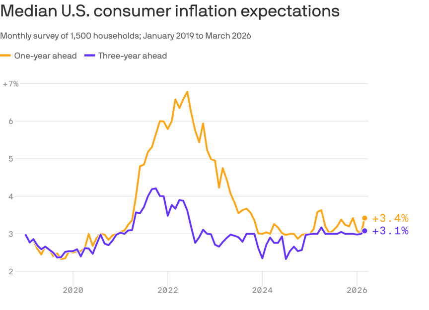American consumers are bracing for an https://www.axios.com/world/iran" target="_blank">Iran war inflation jolt, though they don't anticipate the effects will linger.