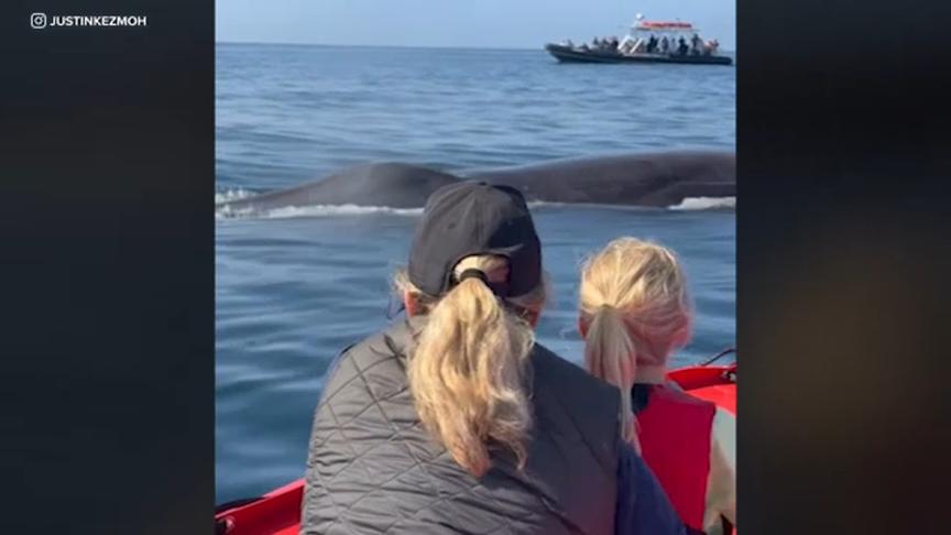 Fin whale surfaces right next to family's boat off Newport Beach, video shows