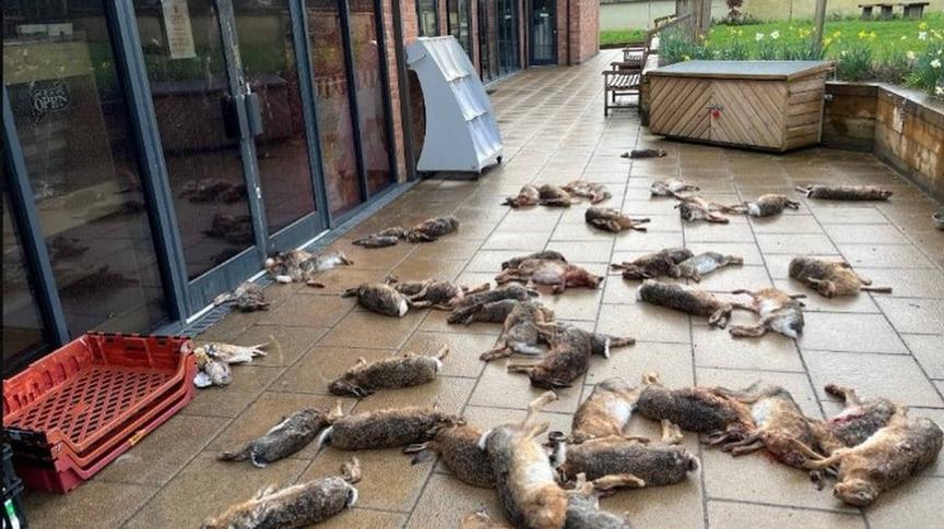 Watch moment man dumps 50 dead hares and smears blood on door outside village shop